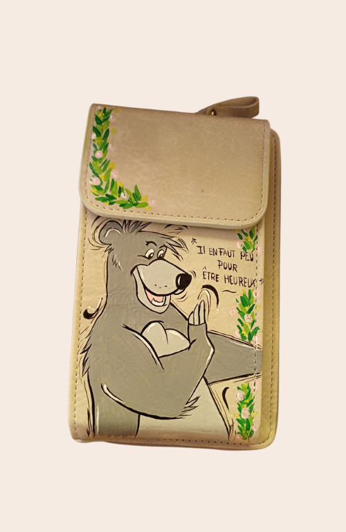 Ce dessin est peint à la main levée en utilisant une peinture spéciale . Ce personnage est le fruit de mon imagination . Une fois la peinture achevée , je la fixe , ainsi le dessin ne s’enlève pas . Une fois la peinture bien sèche , je rajoute un verni imperméabilisant . Pour le nettoyer , c’est simple , une crème spéciale simili cuir ou cuir . C’est un porte carte plat .